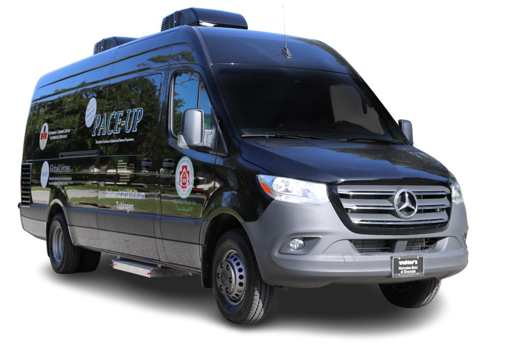 The van is divided into two areas: In the entrance/vestibule there is a folding workstation suitable for computer work or preparation/documentation and a safety level 2 laboratory, ample storage space, Class II biological safety cabinet, type A2, with Class III BSC with HEPA-filtered purge valve, outer cabinet and work surface are welded stainless steel with a pharmaceutical grade. High-capacity motor/blower system with speed control to extend HEPA filter life, Supply and exhaust HEPA filters are positioned parallel to the work area and to each other to prevent turbulence, 10-foot-long power cord with molded grounding plug. Designed to allow optional venting of exhaust air from biosafety cabinet to the outside. 3-door pass-through box to rear external compartment, lab interior and BSC. Allows materials to be moved to the laboratory or vice versa while maintaining containment. Locked doors ensure that the airlock is never open on more than one side at a time.